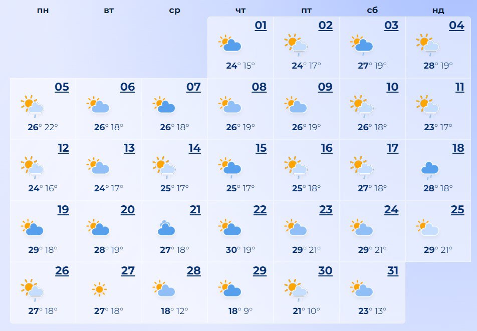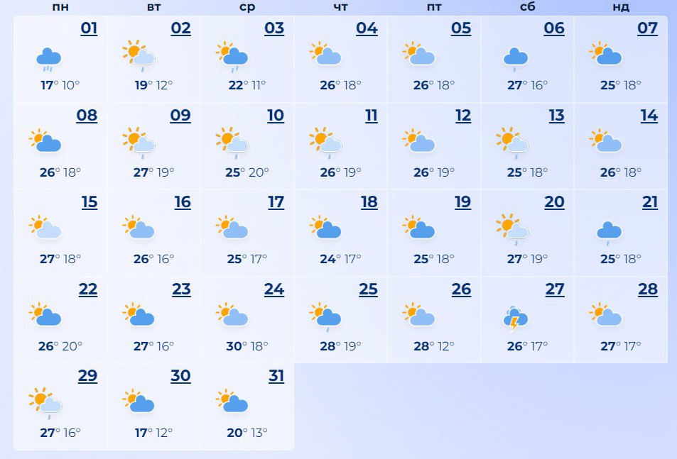 В последний месяц лета погода в Киеве будет облачной. Дожди будут идти в первые пять дней августа, а также 10-го, 11-го, 12-го, 14-го, 15-го, 16-го, 17-го, 18-го, 30-го числа. Днем температура воздуха будет колебаться от +18 до+30 градусов, а ночью – от +9 до 22 градусов.