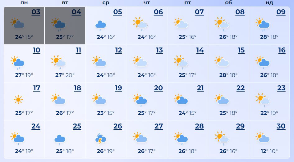 В течение второго летнего месяца в Киеве будут часто идти дожди, погода будет пасмурной. Днем температура воздуха будет колебаться от +17 до +26 градусов, а ночью – от +10 до +20 градусов.