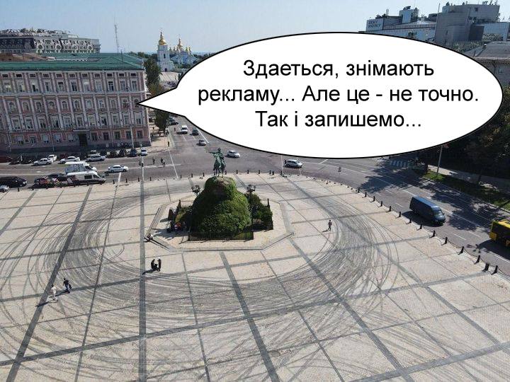 Утром во вторник, 10 августа, на Софийской площади в Киеве во время съемок рекламы автомобили дрифтовали по пешеходной зоне на большой скорости, нанося ущерб покрытию и подвергая опасности жизни пешеходов.