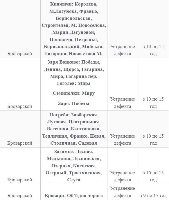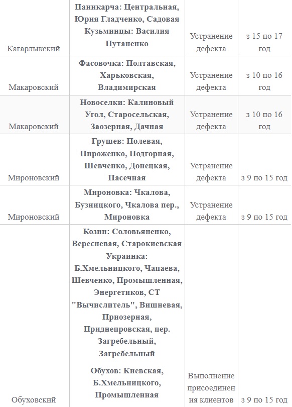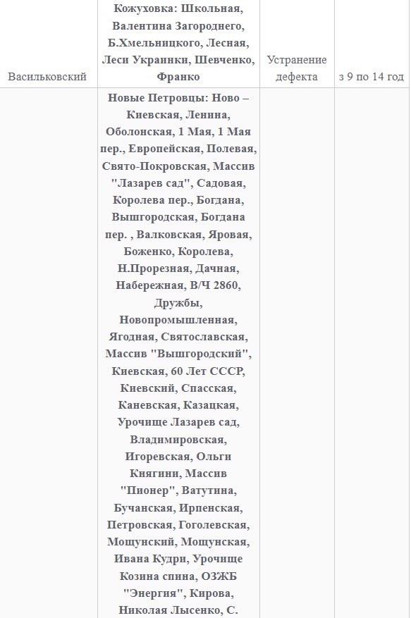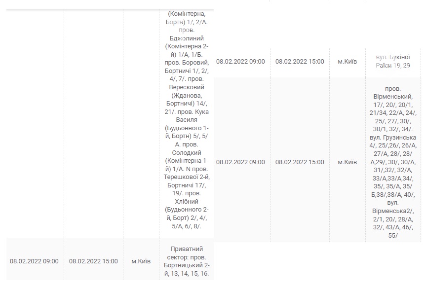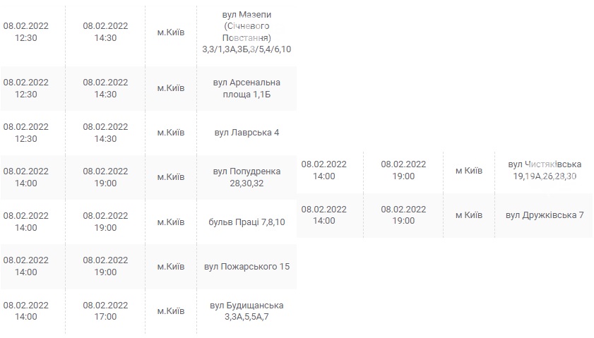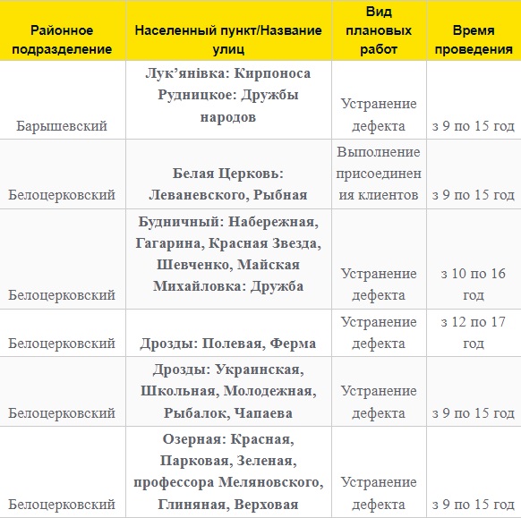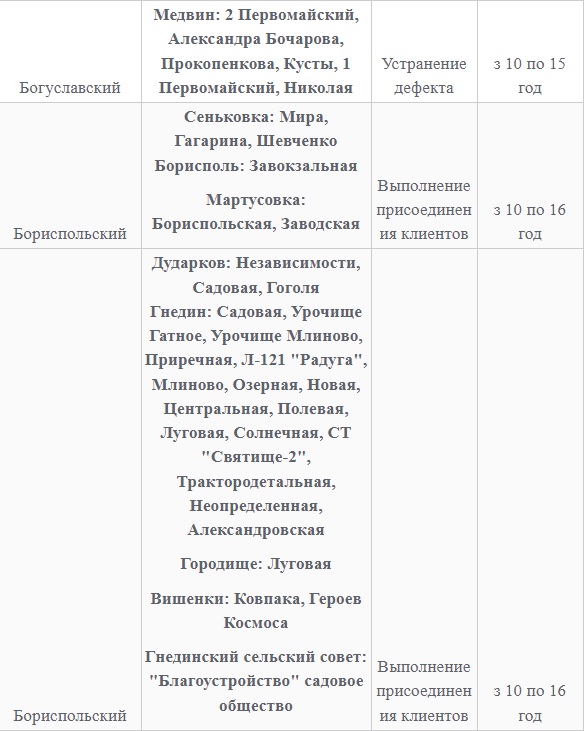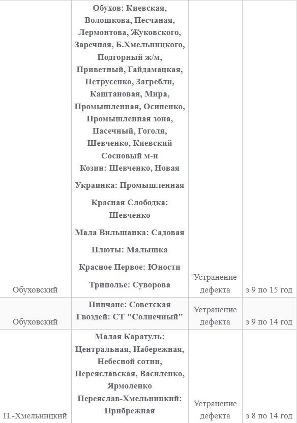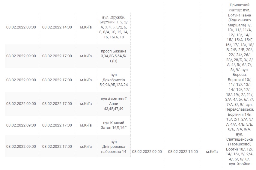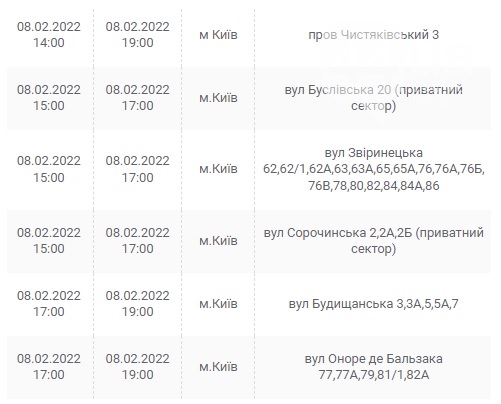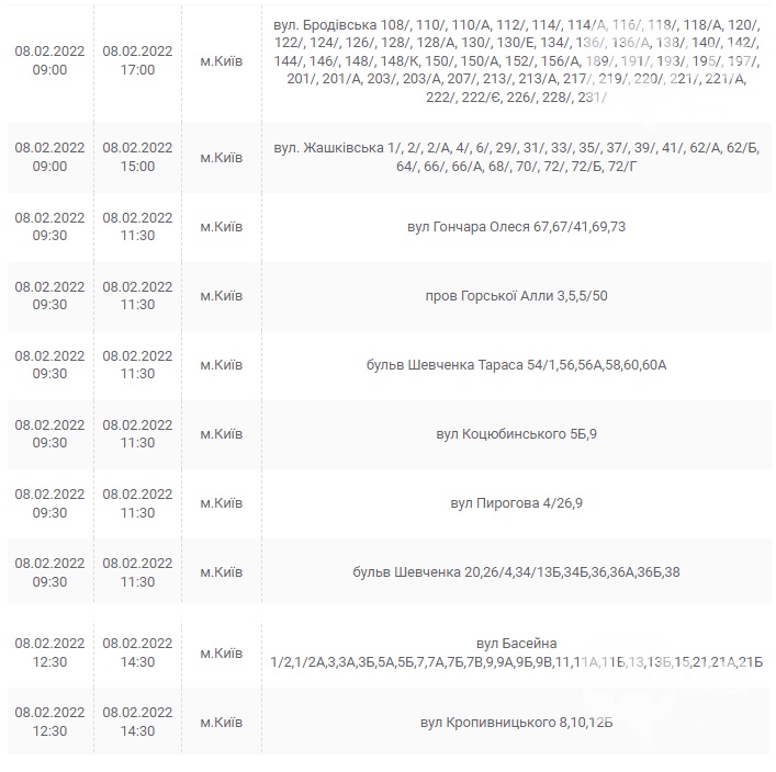 Также 8 февраля ожидаются плановые отключения электроэнергии в Киевской области. Они произойдут в Барышевском, Белоцерковском, Богуславском, Бориспольском, Бородянском, Броварском, Васильковском, Вышгородском, Володарском, Иванковском, Кагарлыкском, Киево-Святошинском, Макаровском, Мироновский, Обуховском, Переяслав-Хмельницком, Сквирском орайонах. Помимо этого без света останется и часть населенных пунктов Ирпенского региона.