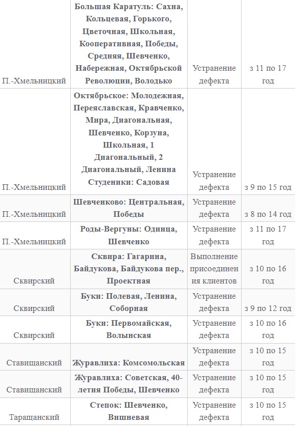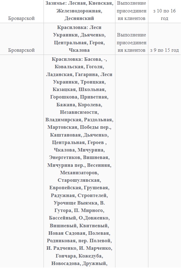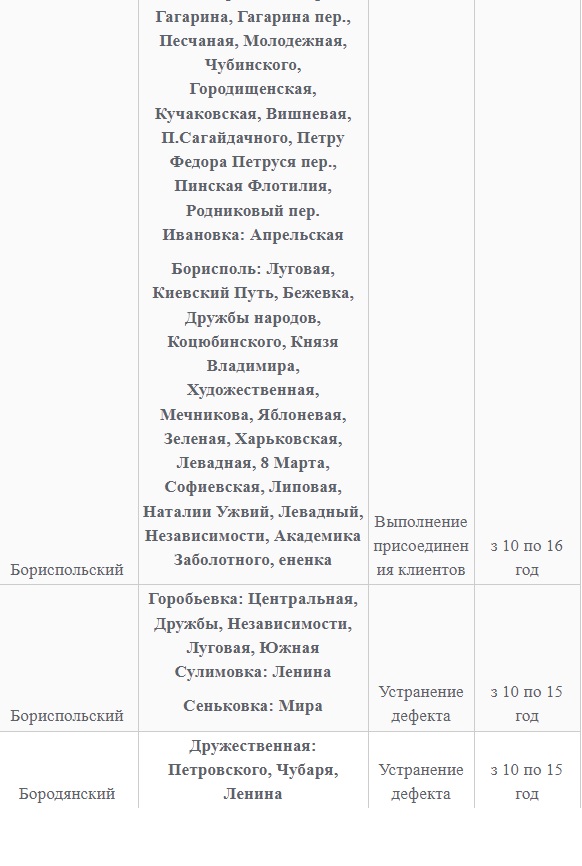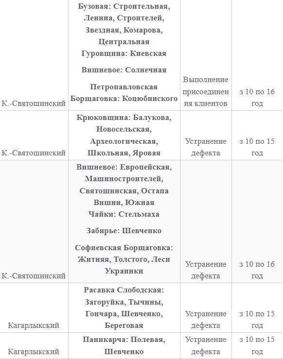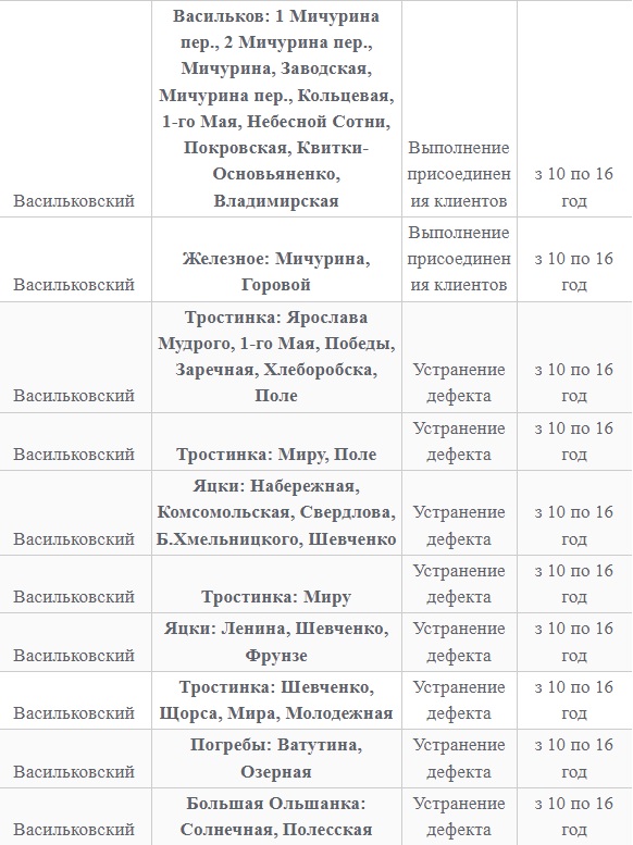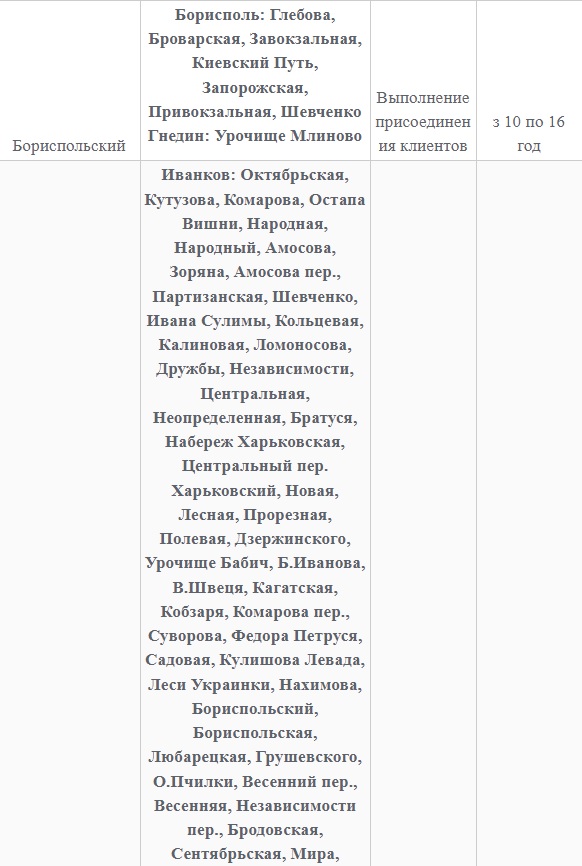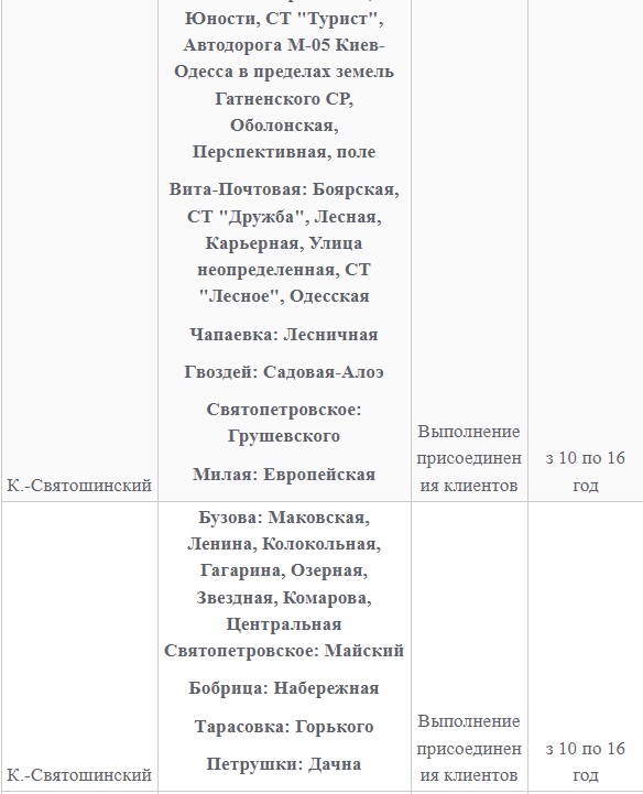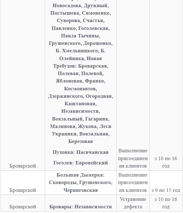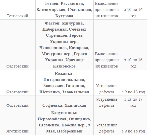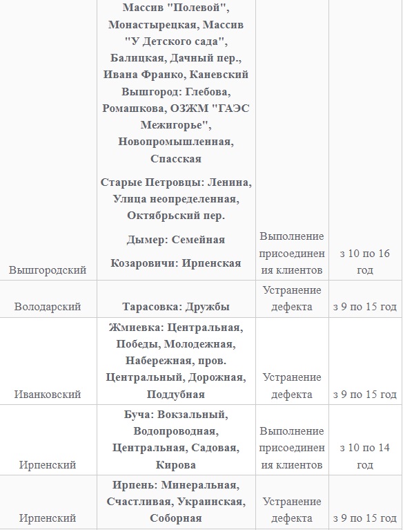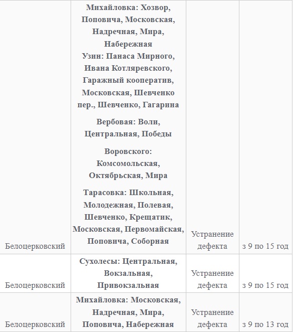 Также 8 февраля ожидаются плановые отключения электроэнергии в Киевской области. Они произойдут в Барышевском, Белоцерковском, Богуславском, Бориспольском, Бородянском, Броварском, Васильковском, Вышгородском, Володарском, Иванковском, Кагарлыкском, Киево-Святошинском, Макаровском, Мироновский, Обуховском, Переяслав-Хмельницком, Сквирском орайонах. Помимо этого без света останется и часть населенных пунктов Ирпенского региона.
