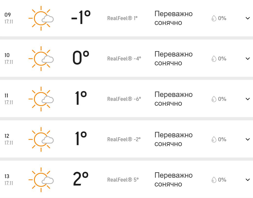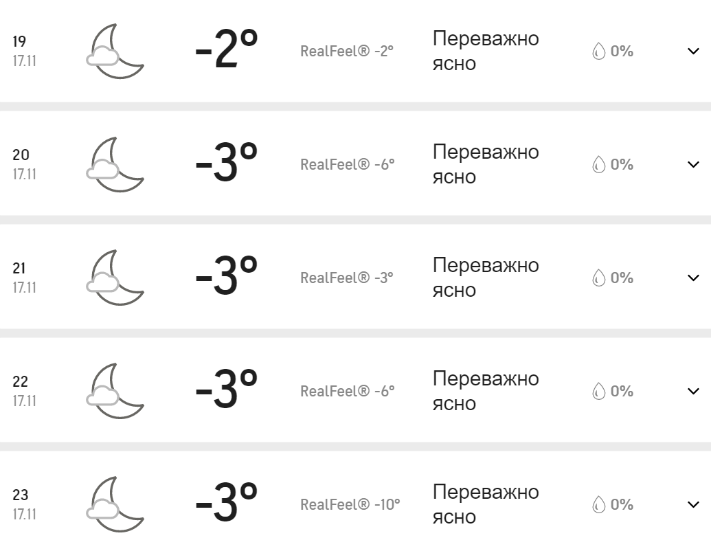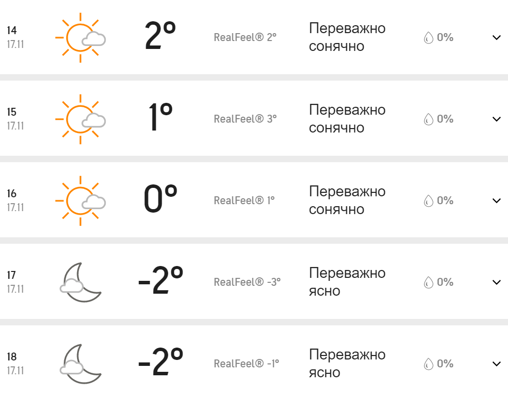 Днем дождь также не омрачит небо над столицей, а солнце будет периодически выходить из-за густых облаков. Температура воздуха достигнет 0°C уже к 16:00, вместе с заходом солнца. С 17:00 на улицах Киева будут ощущаться заморозки.