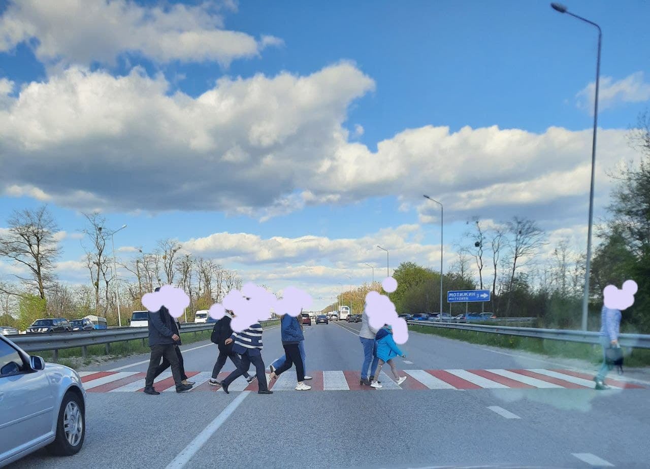 По ее словам, по всей трассе в обе стороны в районе поворота на Мотижин, припаркованные машины препятствовали движению. Люди толпой шли по переходу, тормозя движение по трассе.