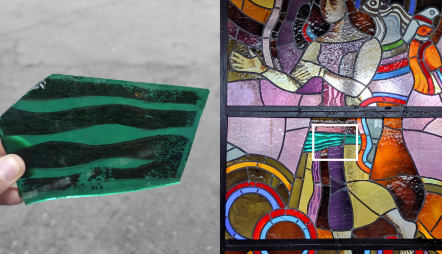 По словам свидетелей, во дворе можно найти только кусочки цветного стекла. Автор витражей - Гнедаш Елена Тимофеевна, ученица Татьяны Яблонской.
