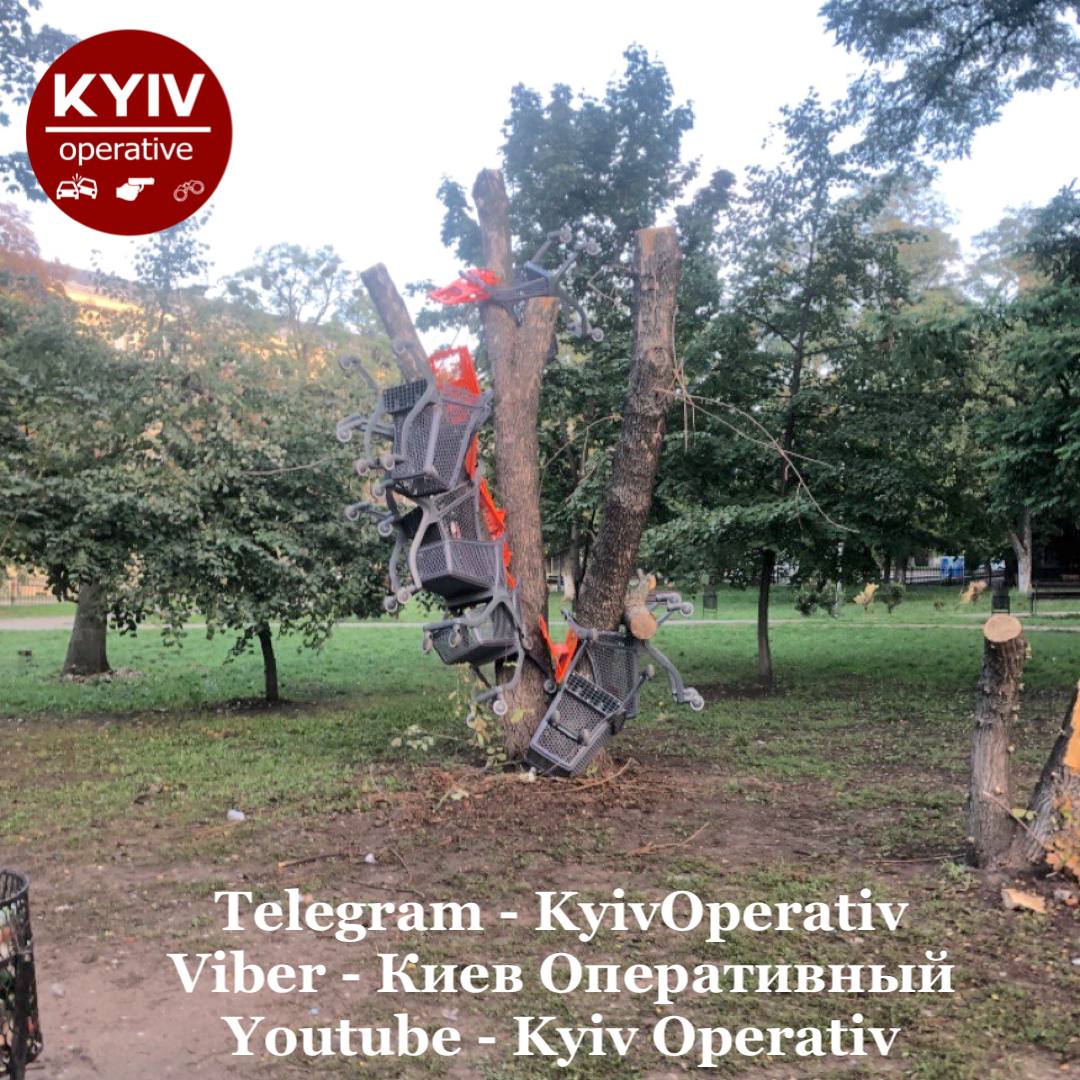 По словам киевлян, с первого сентября в сквере "Поляна", который находится на пересечении ул. Янгеля и Борщаговской, неизвестные "обвешивают" одно и то же дерево тележками из супермаркета. Каждое утро дворник их снимает, а ночью они вновь появляются.