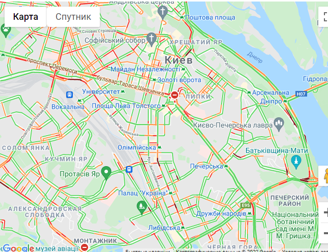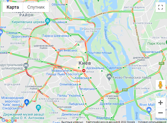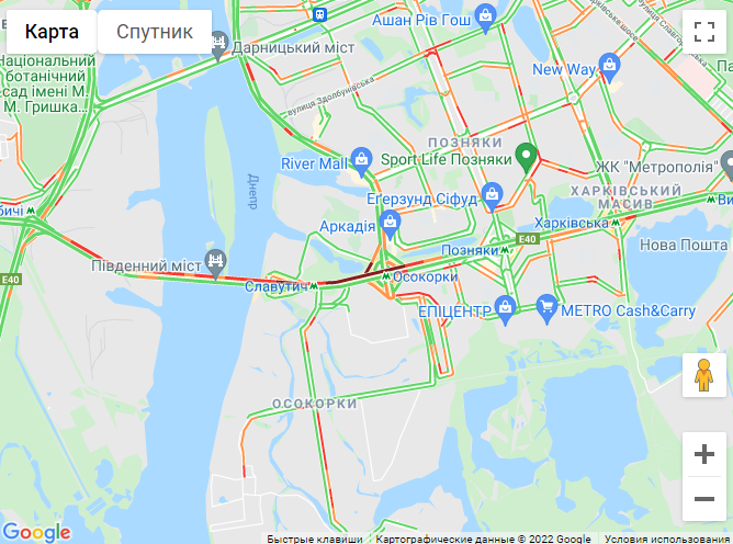 На левом берегу Киева по состоянию на 8:50 наблюдается серьезный затор в районе станций метро "Осокорки", "Славутич" и "Бориспольская". Также пробки есть и на всех мостах через Днепр, что свойственно для утра рабочего дня.