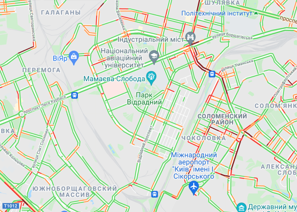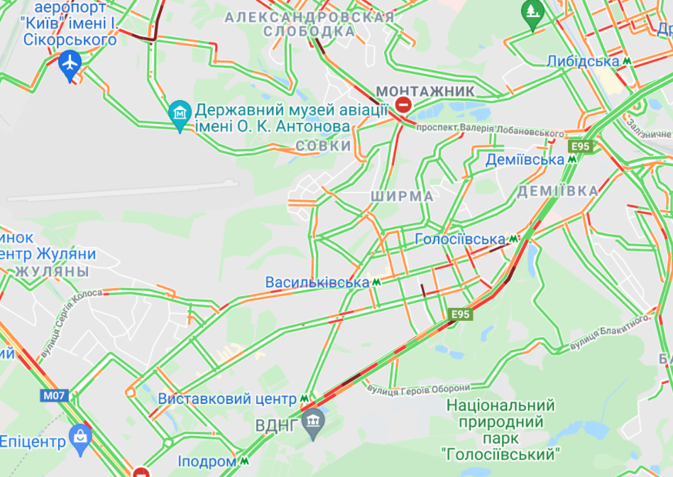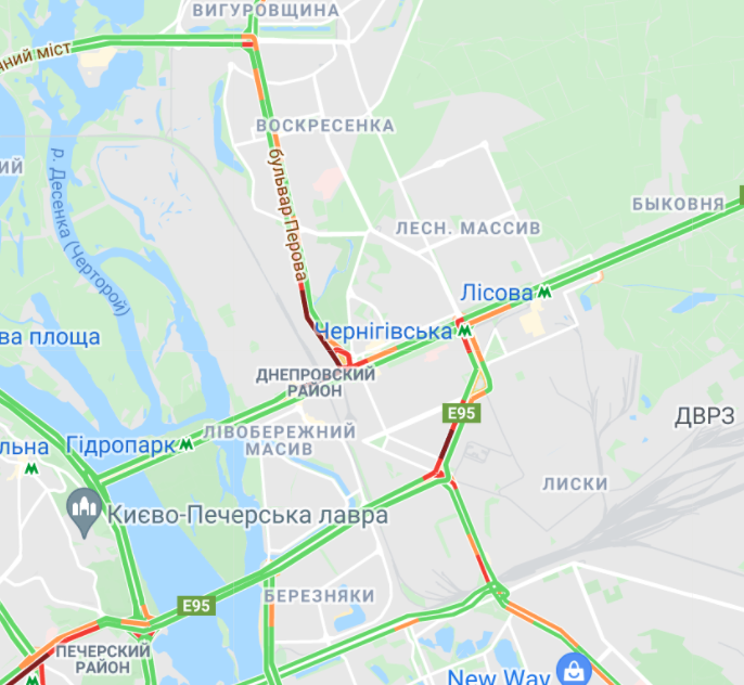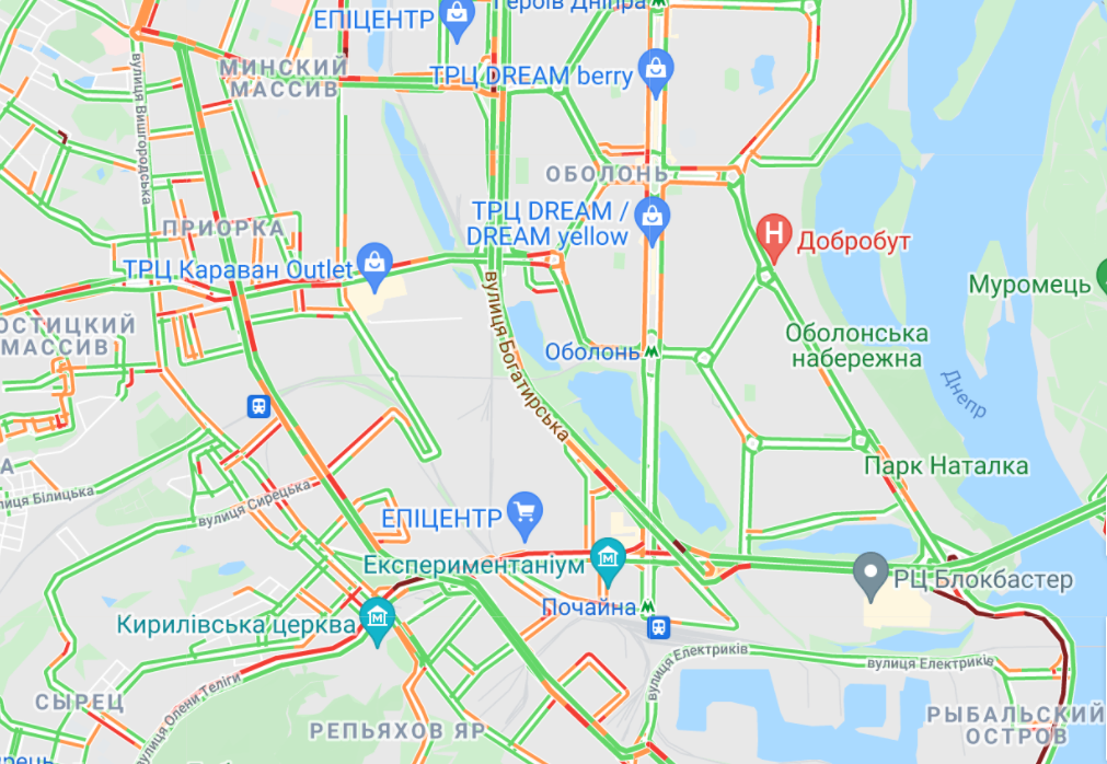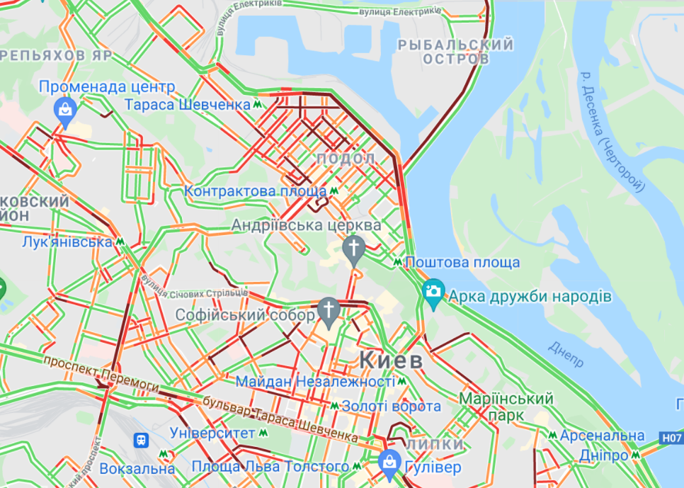 Центр Киева почти полностью остановился в пробках. Большой затор образовался на Набережно-Рыбальской. Трудно проехать вблизи Бессарабской площади и по проспекту Вячеслава Черновола. Мелкие заторы образовались в небольших кварталах.