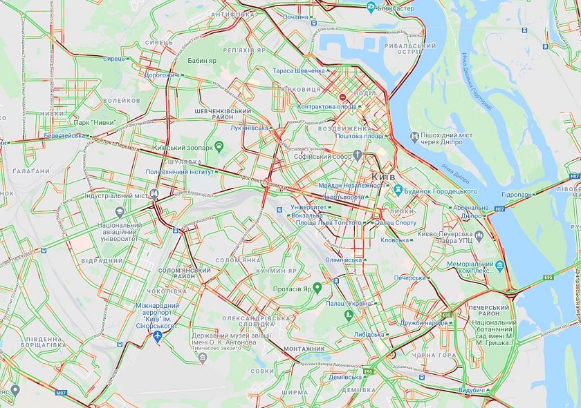 Транспорт практически замер на нескольких участках бульвара Леси Украинки и на бульваре Дружбы Народов, стоят автомобили также на улице Набережно-Рыбальской и проспекте Степана Бандеры. Трудности с проездом существуют на проспекте Валерия Лобановского и примыкающей к нему части Воздухофлотского проспекта, а также на улицах Саксаганского, Новоконстантиновский и на Крещатике.
