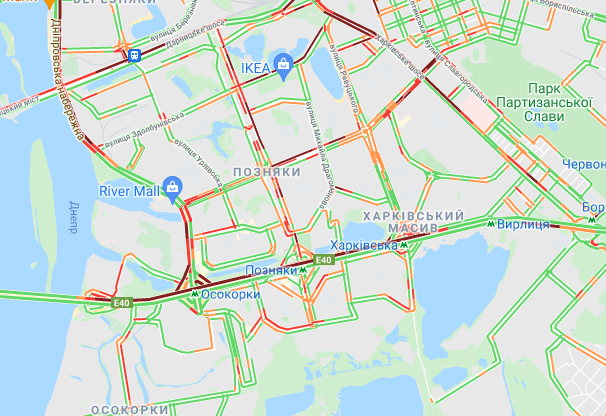 Сегодня, как и вчера, водители стоят в "тянучке" от станции "Вырлица" до метро "Славутич". Также пробки образовались на некоторых близлежащих улицах. Примерная длина затора - около 4 км.
