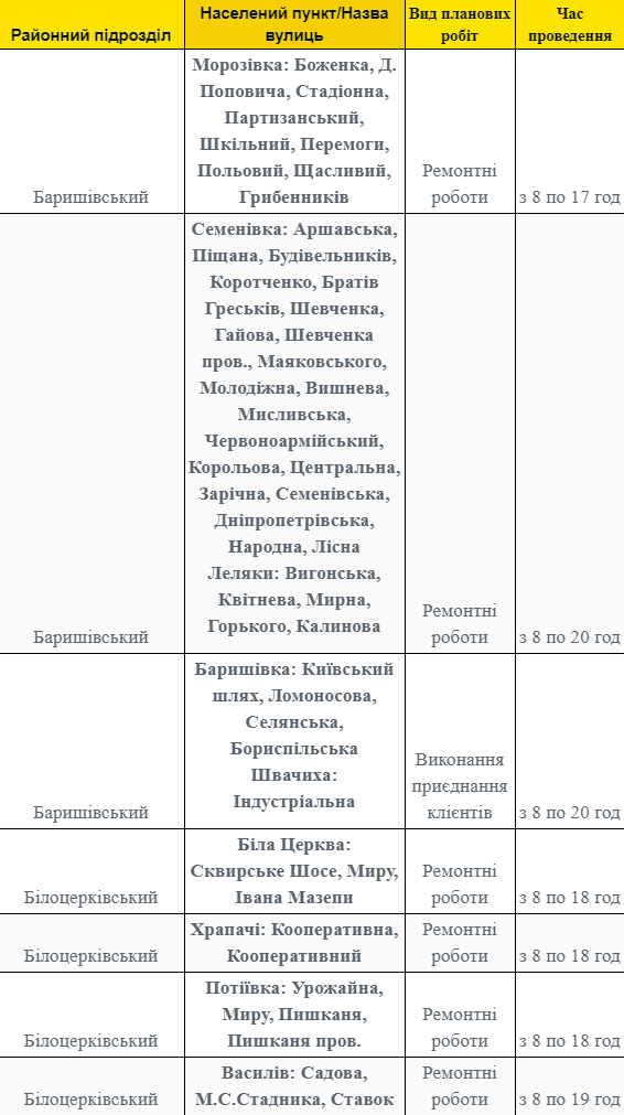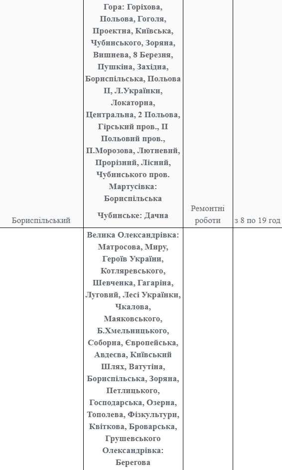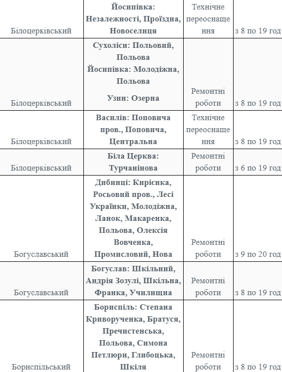 Так, коммунальные службы прекратят поставки электроэнергии на некоторых улицах в Барышевском, Вышгородском, Володарском, Белоцерковском, Богуславском, Броварском, Васильковском, Згуровском, Иванковском, Кагарлицком, Бориспольском, Бородянском, Обуховском, Переяслав-Хмельницком, Ирпенском, Киево-Святошинском, Макаровском, Сквирскому, Тетиевском, Мироновском, Рокитнянском, Фастовском, Ставищенском, Таращанском, Чернобыльском и Яготинском районах.