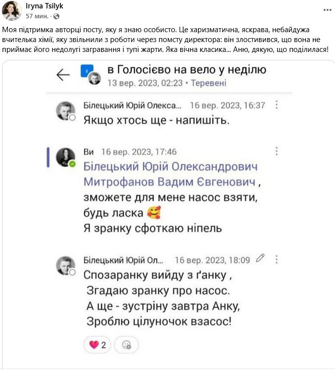 "Моя поддержка автору поста, которую я знаю лично. Это харизматичная, яркая, неравнодушная учительница химии, которую уволили с работы из-за мести директора: он озлобился, что она не принимает его бестолковые заигрывания и тупые шутки. Какая вечная классика...", - отметила Цилык.