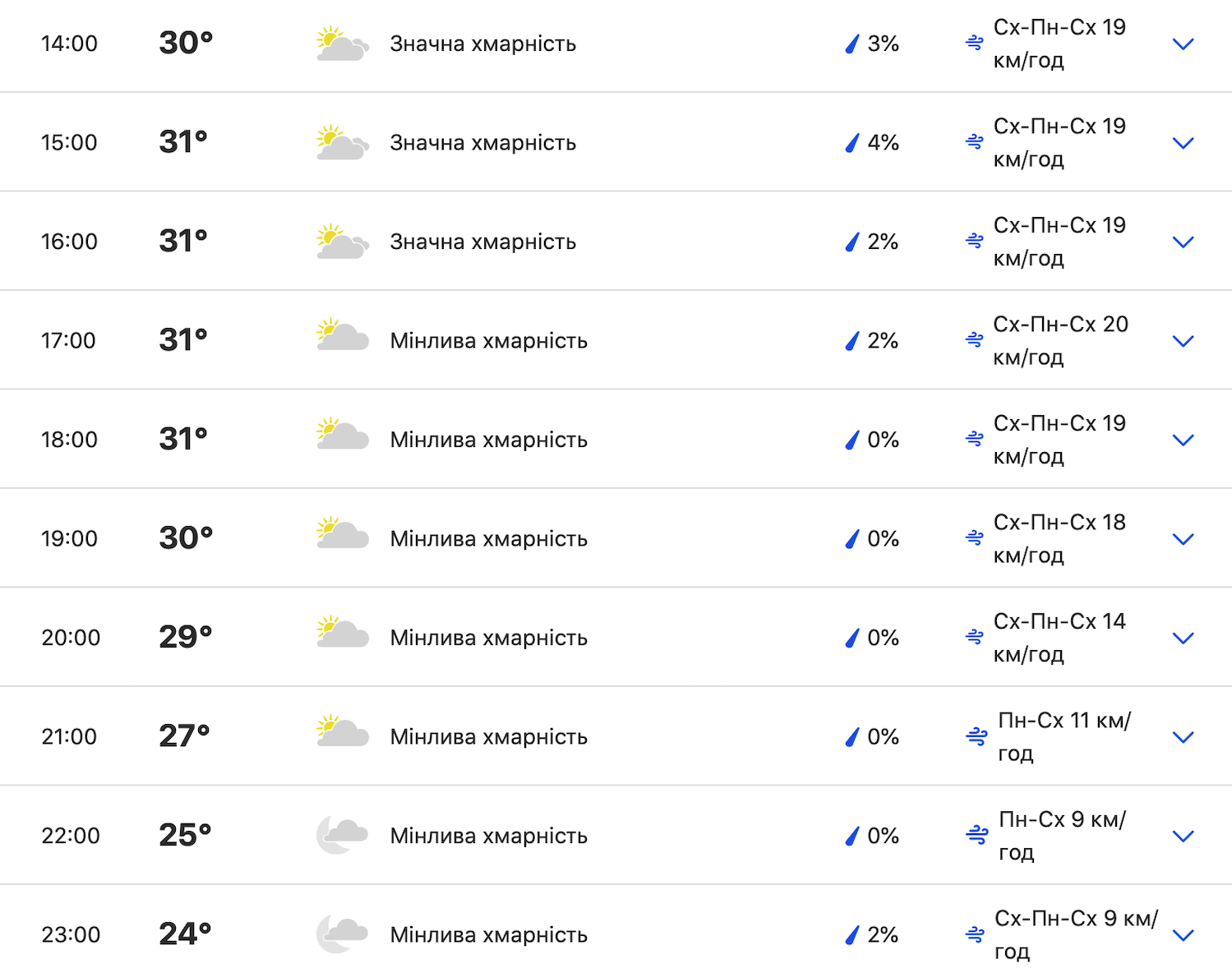 Высокая температура воздуха и отсутствие ветра повлекут за собой негативные условия для пребывания на улице - там будет духота и жара. С утра температура поднимется от +24 градусов и достигнет отметки в +30 уже в час дня, а с 15:00 до 18:00 продержится на уровне +31 градус, и только к вечеру снова начнет спадать до +24 градусов.