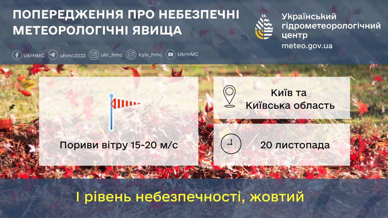 Кроме того, синоптики также предупреждают о І (желтом) уровне опасности из-за сильных порывов ветра, которые ожидаются по г. Киев и области.