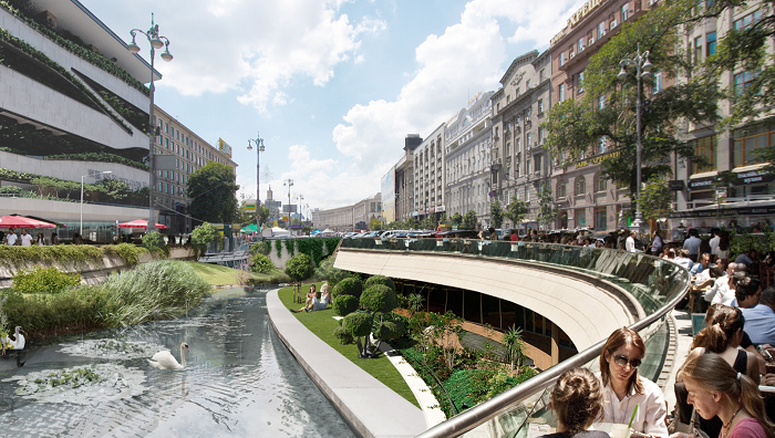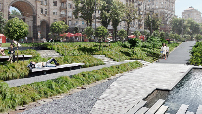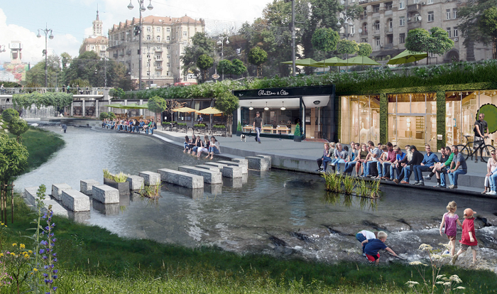 По словам автора, проезжую часть улицы Крещатик можно отдать под реку, а пешеходную – заменить зоной для отдыха.