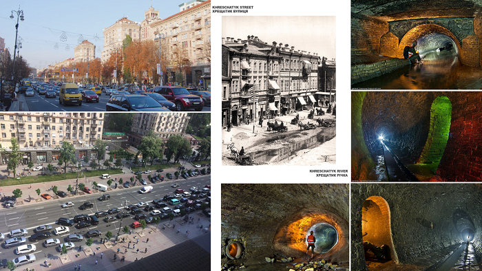 "В Киеве находится более 60 подземных рек, в том числе и река Крещатик, которая и сегодня протекает в коллекторе под одноименной центральной улицей города... Восстановив хоть часть этих рек в сочетании с существующим холмным ландшафтом столица превратится в современную, уникальную, экологически комфортную среду " , - пишет автор.