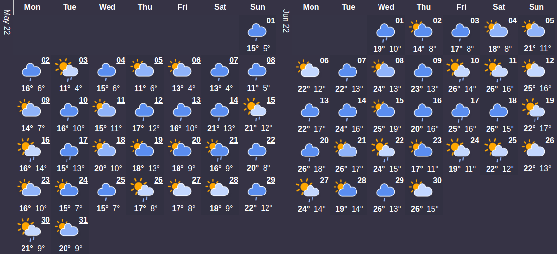 Май в Киеве в 2022 году будет довольно прохладным: всего четыре дня температура намерена прогреваться выше 20°С. Выходные дни в мае, согласно прогнозу, будут подпорчены небольшими дождями.