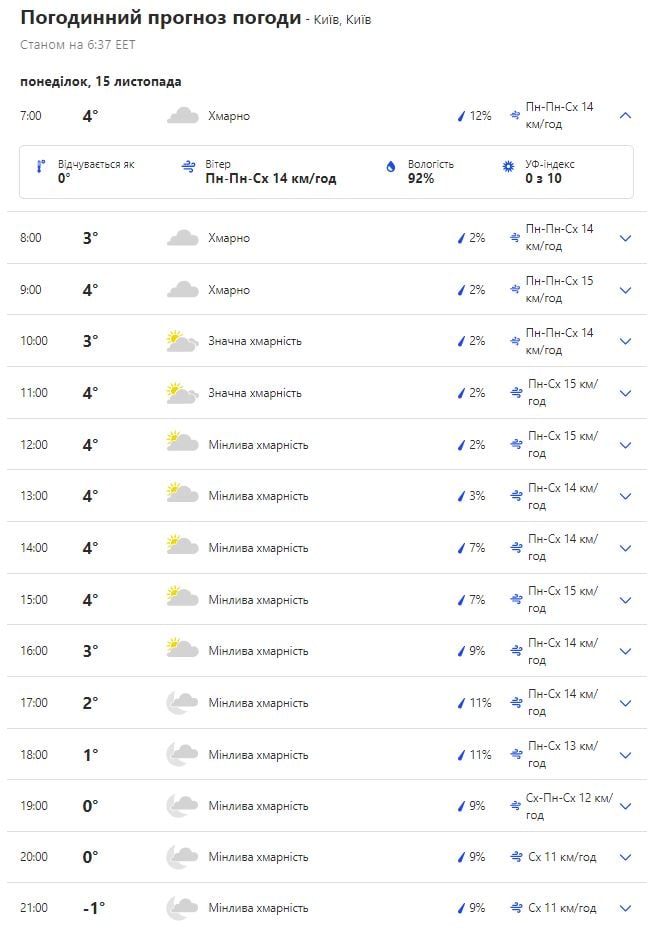 Погода в Киеве 15 ноября - почасовой прогноз