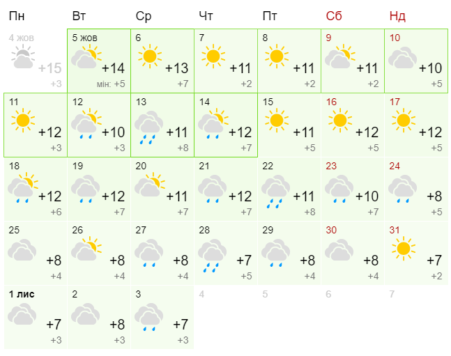 С 25 по 31 октября погода немного наладится, но небо останется таким же пасмурным. К концу месяца значительно похолодает: примерно 7-8 градусов тепла днем.