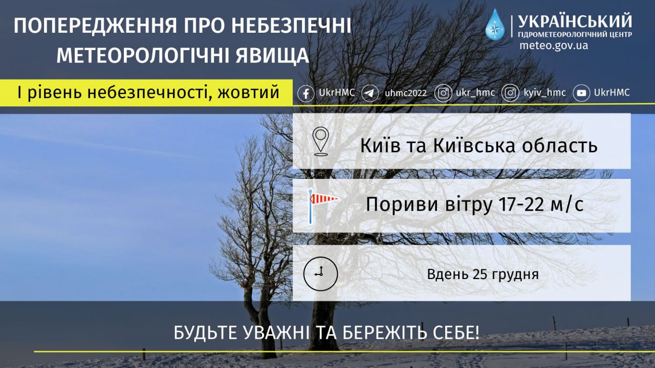 "В Киевской области 25 декабря облачно с мокрым снегом с переходом в дождь. На дорогах местами гололедица. Ветер юго-западный с переходом на западны, 7-12 м/с, днем порывы 17-22 м/с. Температура ночью 0-5° мороза, днем 4-9° тепла. В Киеве ночью 1-3° мороза, днем 6-8° тепла. Предупреждение об опасных метеорологических явлениях по Киевской области. Днем 25 декабря порывы ветра 17-22 м/с. I уровень опасности, желтый", - говорится в сообщении.
