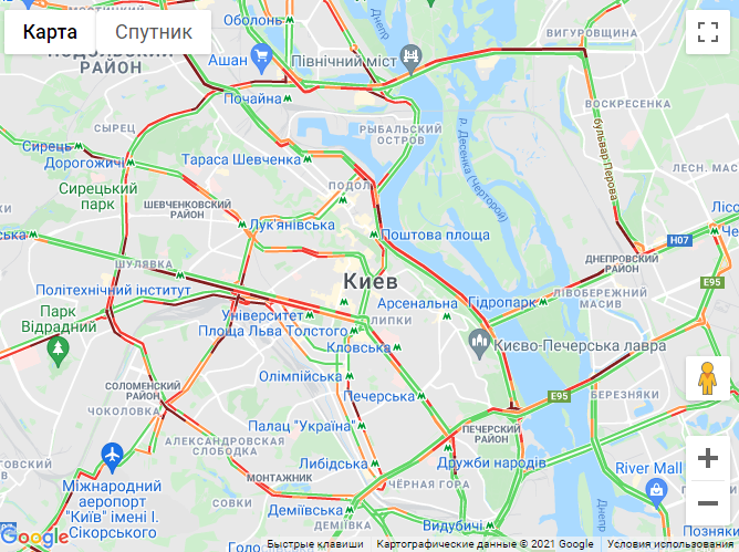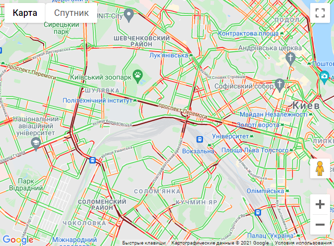 Авто стоят в пробке на проспекте Победы (от ст. метро "Политех" до ул. Саксаганского). Затруднено движение транспорта на ул. Борщаговская. Трудно проехать по Набережному шоссе.