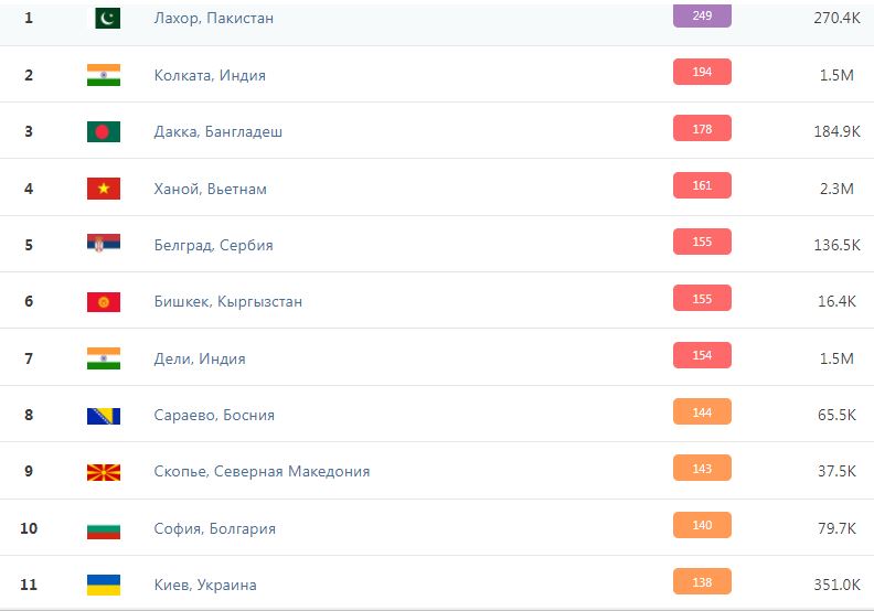 Киев уже не первый раз оказался среди лидеров "грязнуль". Возглавил этот печальный список город Лахор (Пакистан), на втором месте индийский город Колката, на третьем – Дакка, Бангладеш. В пятерке лидеров этого антирейтинга также оказались Ханой (Вьетнам) и Белград (Сербия).