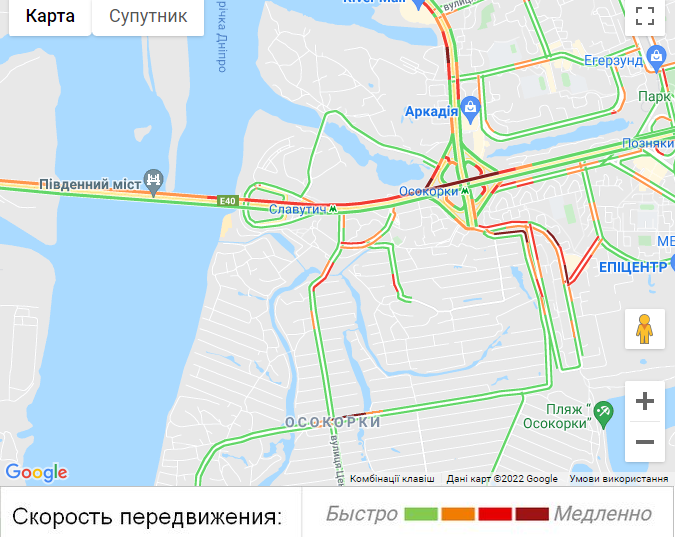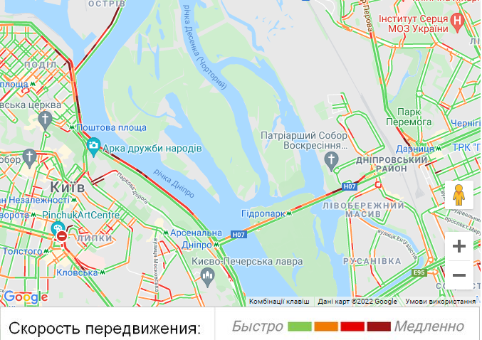 Движение на правом берегу затруднено возле моста "Метро". Медленный трафик на Набережном шоссе в сторону Речного вокзала, а дальше – на улице Набережно-Крещатицкая. Довольно медленное движение на улице Набережно-Рыбльская в направлении правого берега, а дальше – на Гаванском автомобильном мосту. На проспекте Соборности и мосту Патона в направлении правого берега.