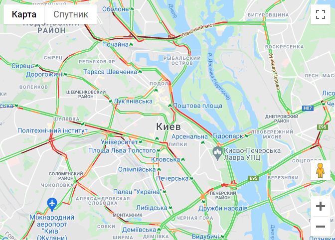 Традиционно проблемы с движением в центре города и на подъездах к нему. Трудности с проездом существуют у Бессарабского рынка, пробки образовались на части Набережного шоссе, Воздухофлотского проспекта, проспектах Победы, Степана Бандеры и Любомира Гузара, на улице Вадима Гетьмана и некоторых других улицах столицы.