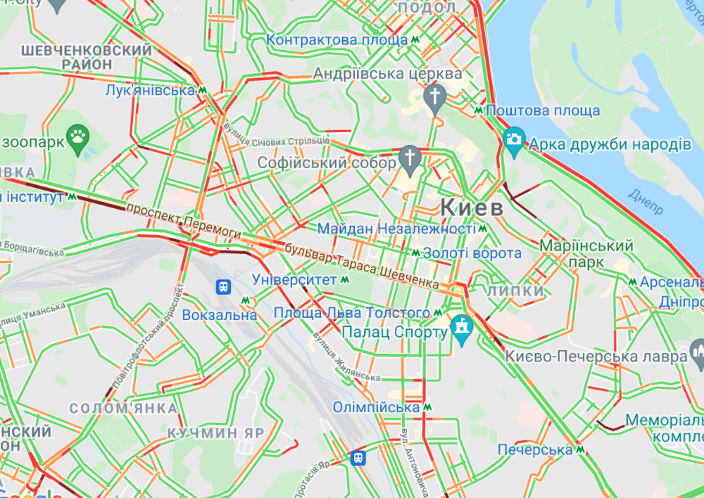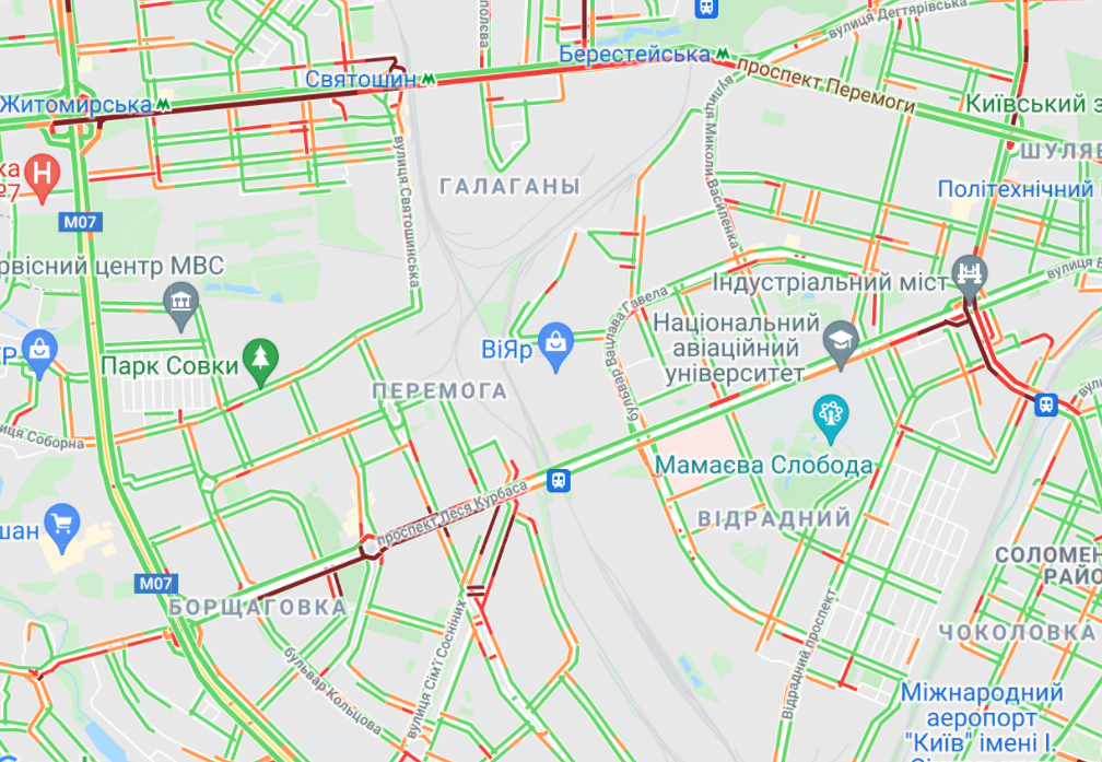 Пробки образовались на Софиевской Борщаговке и Кольцевой дороге. Больщой затор наблюдается между станциями метро "Берестейская" и "Житомирска" в обе стороны. Автомобили стоят в заторах на проспекте Леся Курбаса, улице Вадима Гетьмана и на проспекте Лобановского. Образовались длинные пробки на проспекте Степана Бандеры, ул. Вышгородская и просп. Героев Сталинграда.