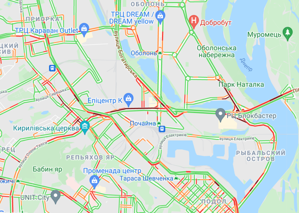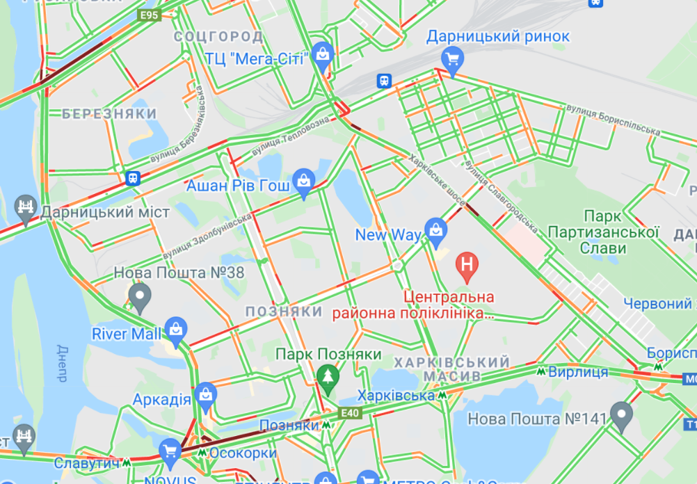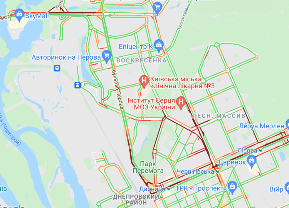 Трудно проехать по проспекту Романа Шухевича и Северному мосту, у станций метро "Лесная", "Черниговская", "Дарница" и "Левобережная", по ул. Братиславская, проспекте Освободителей и ул. Генерала Жмаченка и ул. Миропольская. Пробки образовались у ст. метро "Осокорки" и "Позняки", а такжена проспекте Соборности.