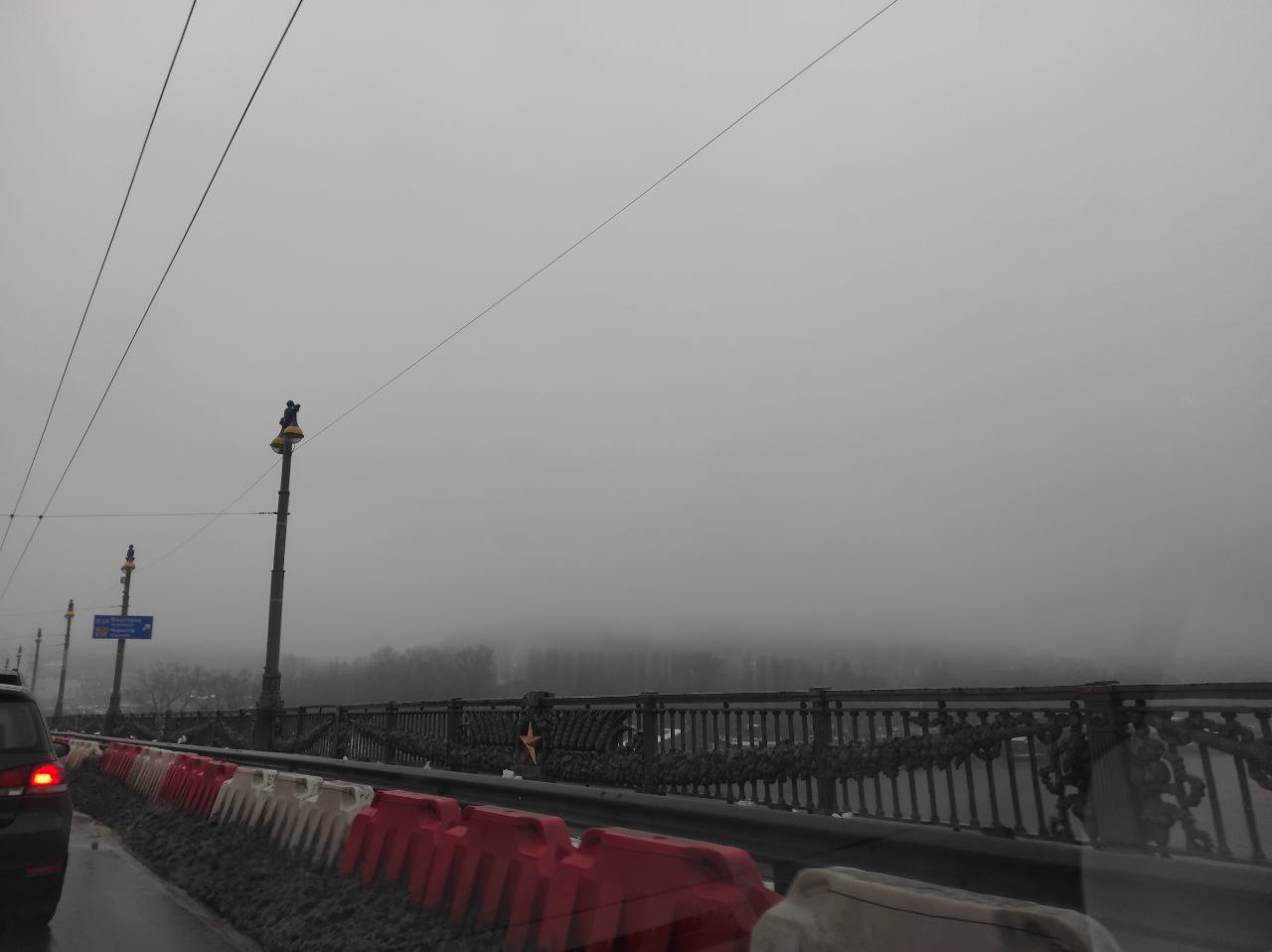 Из-за ухудшения погодных условий монумент "Батькивщина-Мать" не виден с моста Патона. Густой туман, которым окутало Киев, также способствовал осложненному движению транспорта на некоторых улицах столицы.