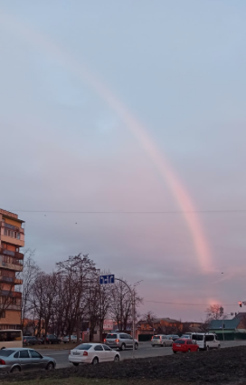 Жители столицы делятся фотографиями радуги, которая раскинулась над городом утром 21 февраля.