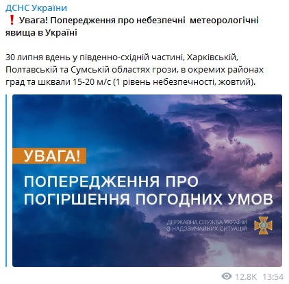"30 июля днем в юго-восточной части, Харьковской, Полтавской и Сумской областях грозы, в отдельных районах град и шквалы 15-20 м / с (1 уровень опасности, желтый)", – написала пресс-служба ГСЧС.