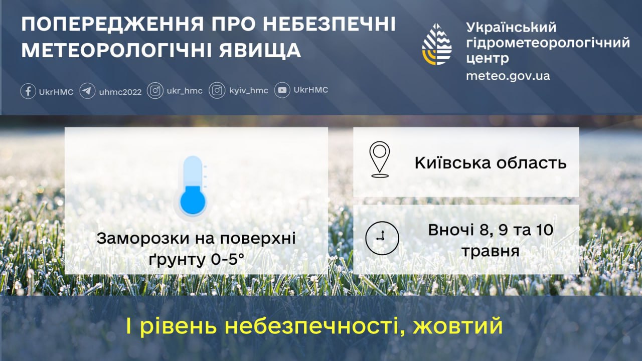 "Предупреждение об опасных метеорологических явлениях в Киевской области. Ночью 8, 9 и 10 мая на поверхности грунта заморозки 0-5°С. I уровень опасности желтый", - говорится в сообщении.
