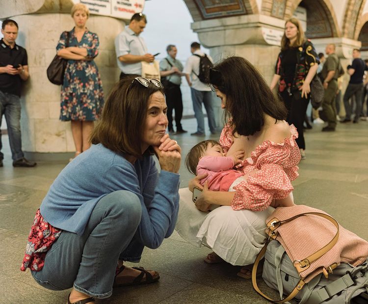 Александр Маслов сфотографировал женщину по имени Виктория, сидящую на корточках в метро под землей, и кормящую грудью свою дочь. Рядом с ними сидит бабушка и грустно улыбаясь, погрузилась в свои мысли.