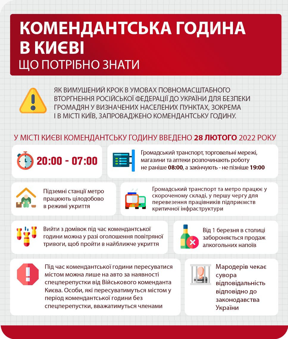 • Во время комендантского часа передвигаться по городу можно только на авто при наличии спецпропуска от Военного коменданта Киева.