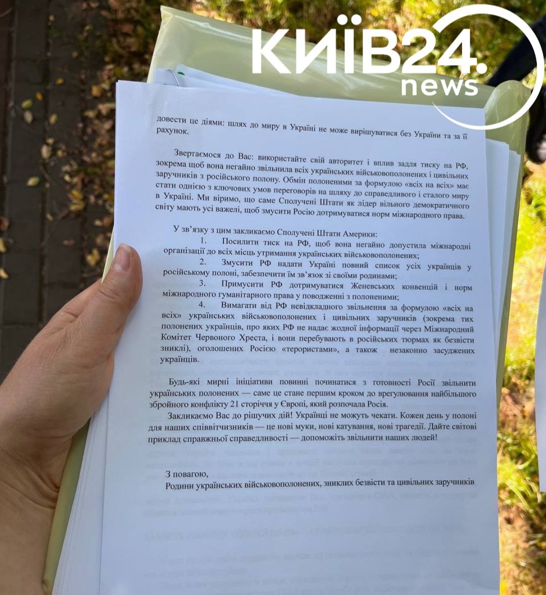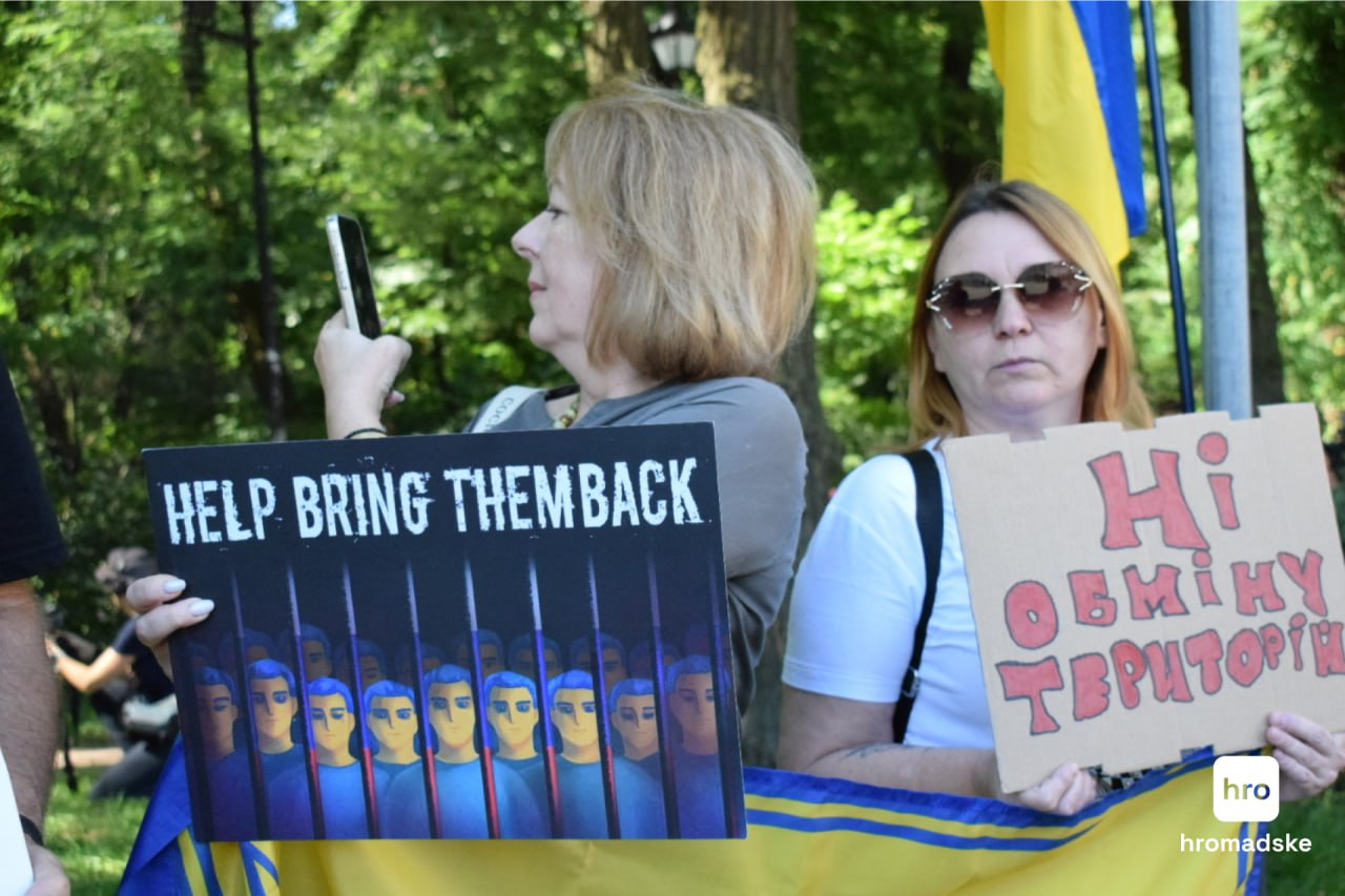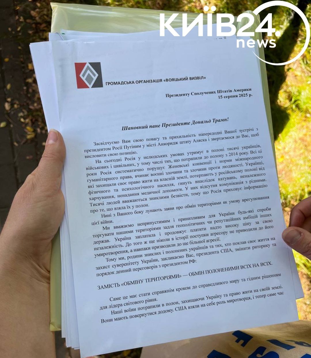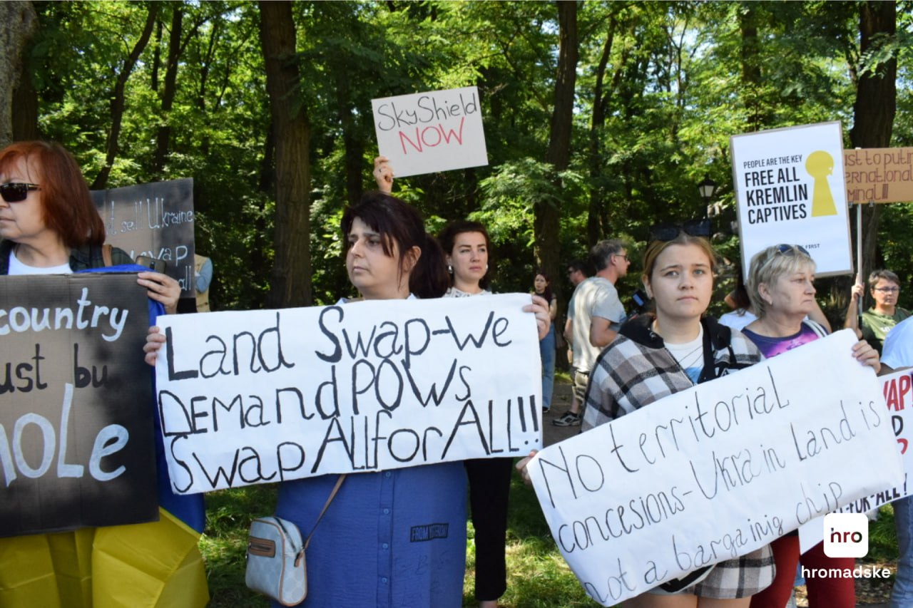 Перед встречей президента США Дональда Трампа и российского диктатора Владимира Путина на Аляске 15 июля родственники украинских военнопленных провели акцию протеста под зданием посольства США в Киеве. Они требовали начать мирные переговоры по вопросу возвращения пленных, а не обмена территориями.