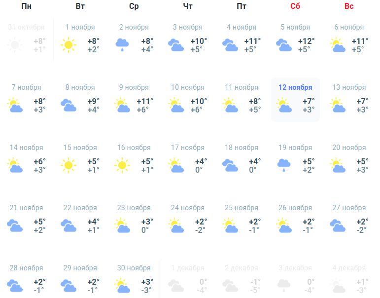 Существенное снижение температуры жители столицы ощутят в последней декаде ноября. Днем столбики термометров будут показывать от +2 до +5 градусов, а ночью уже возможны заморозки до минус трех градусов.