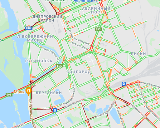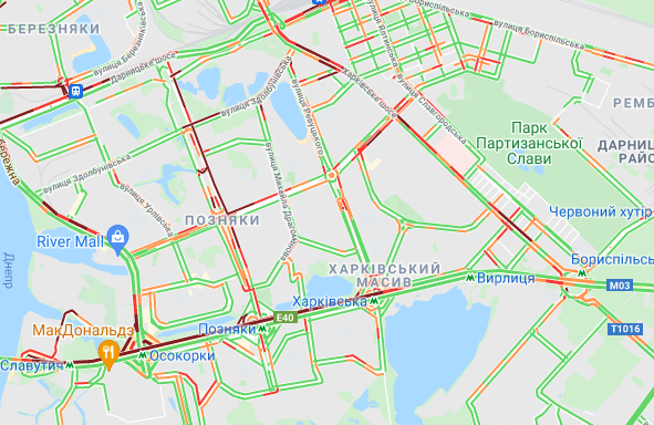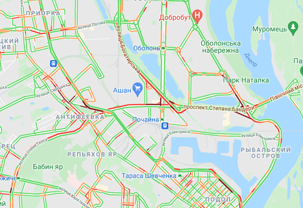 Затруднено движение авто на проспекте Романа Шухевича, возле станций метро "Лесная", "Черниговская", "Гидропарк" и "Левобережная", на Харьковском шоссе. Трудно проехать по проспекту Соборности, Дарницкому шоссе, Днепровской Набережной, а также по проспекту Николая Бажана, вблизи станций метро "Осокорки", "Славутич", "Позняки" и "Харьковская".