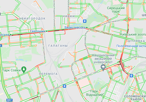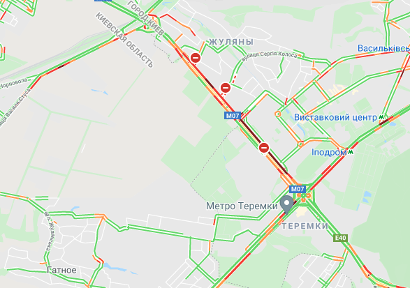 От станции метро по Кольцевой дороге стоит движение авто. Образовались пробки на улице Вадима Гетьмана и проспекте Леся Курбаса, проспекте Лобановского. Наблюдаются заторы на ул. Богатырская, ул. Семена Скляренко (возле Куреневского парка) и на проспекте Степана Бандеры. Трудно проехать возле станций метро "Житомирская", "Святошин" и "Берестейская".