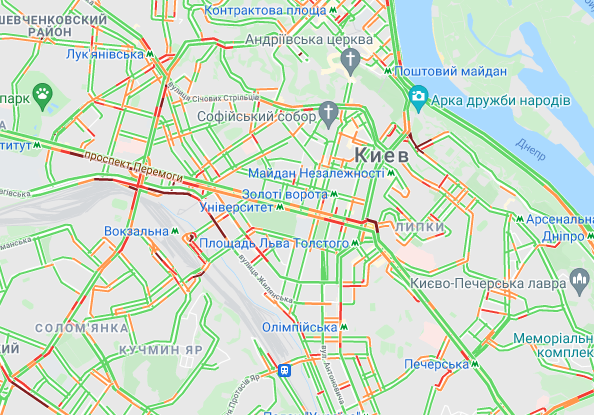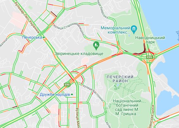 Затруднено движение транспорта на ул. Жилянская и возле Бессарабской площади. Трудно проехать Набережно-Крещатицкой. Заторы образовались на бульваре Дружбы народов.