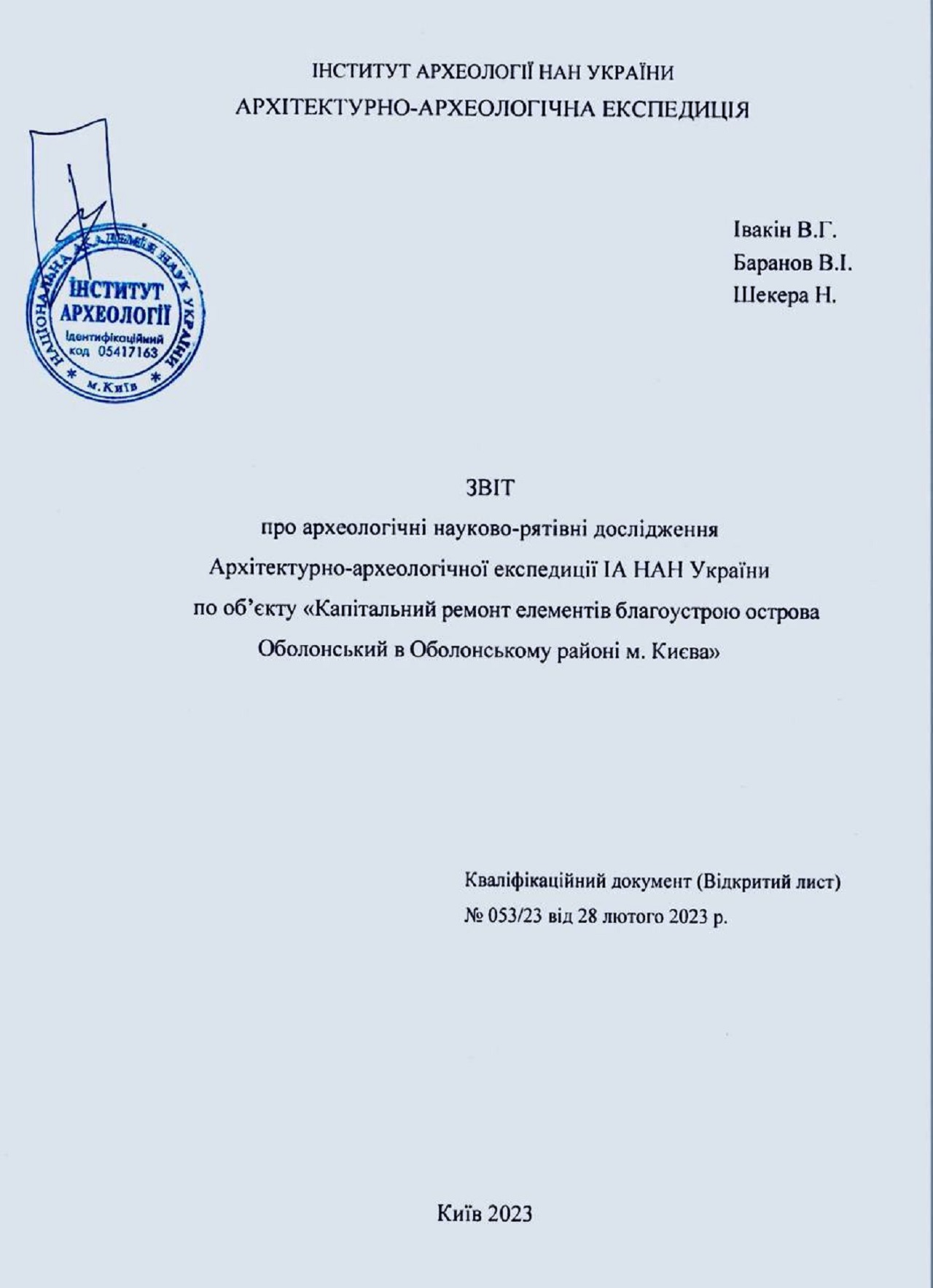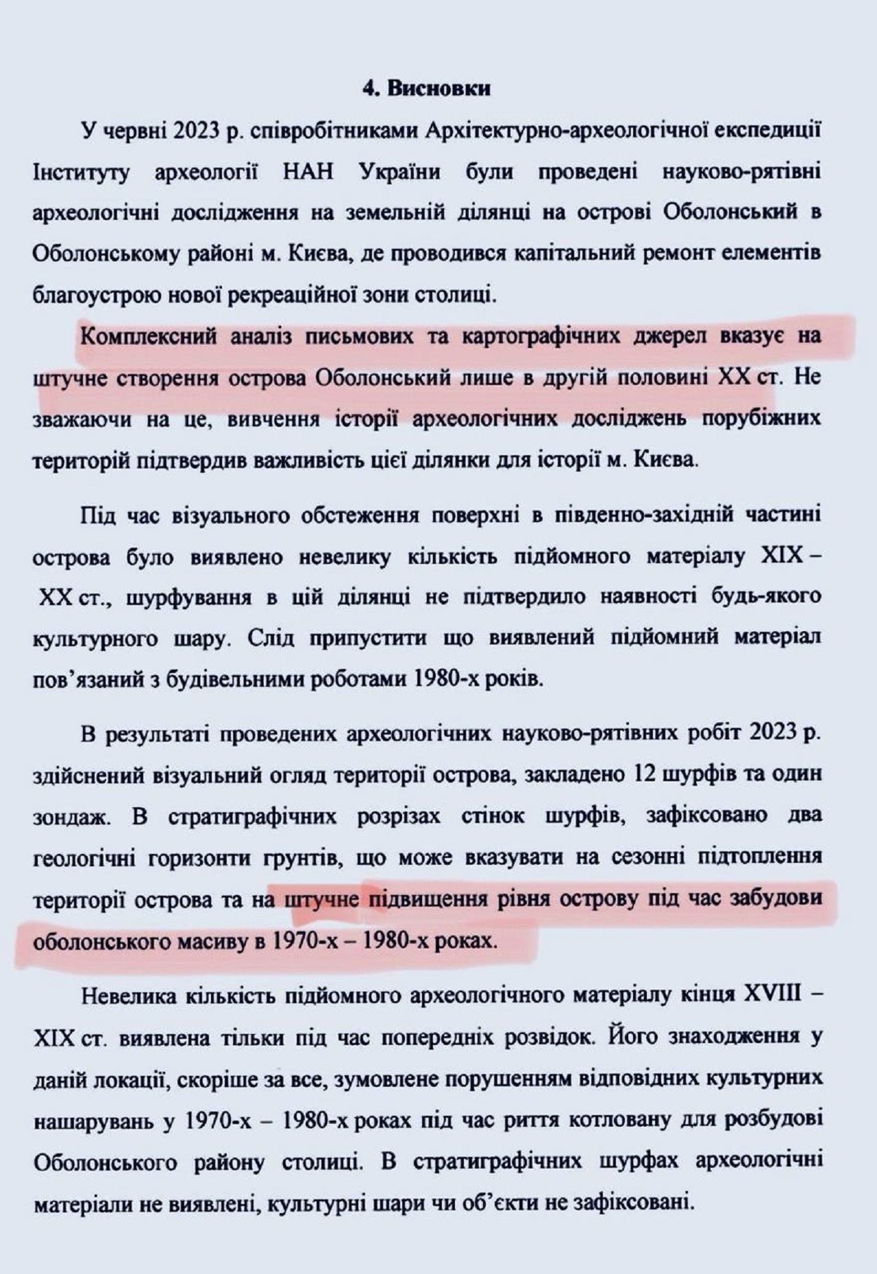 Он отмечает, что по итогам проведения археологических научно-спасательных работ 2023 установлено искусственное повышение уровня острова во время застройки Оболонского массива в 1970–1980. В стратиграфических шурфах археологические материалы не обнаружены, культурные слои или объекты не зафиксированы.