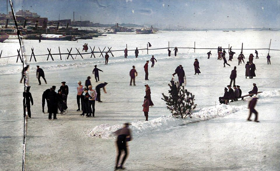 "1890-е. На переднем плане киевляне с клюшками. Ледовый крокет в те времена стал популярной игрой в Европе и Киев не обошла эту моду", - говорится в сообщении.