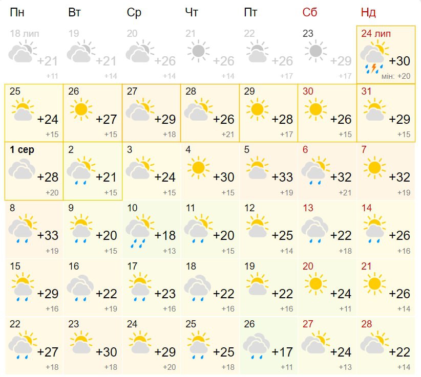 Самая низкая дневная температура месяца - 17 градусов тепла, она прогнозируется в столице 26 августа. По предварительным прогнозам синоптиков, в последний месяц лета в Киеве будет целых 15 дождливых дней.