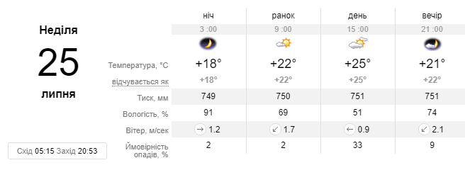В воскресенье, 25 июля, днем в Киеве на небе появятся облака, которые вечером должны рассеяться. Без осадков. Ожидается температура воздуха от 18 до 25 градусов.