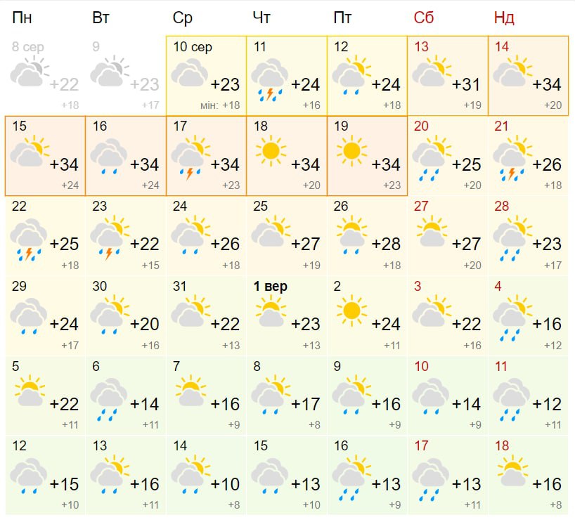 До 18 сентября в Киеве будет 12 дождливых дней, столбики термометров в этот период в дневные часы будут показывать от +10 до +24 градусов. По мере того, как осень будет набирать обороты, в столице будет становиться все прохладнее.