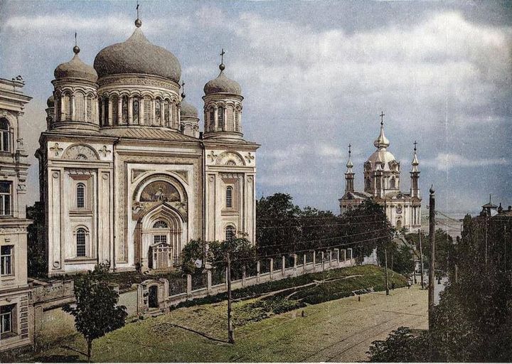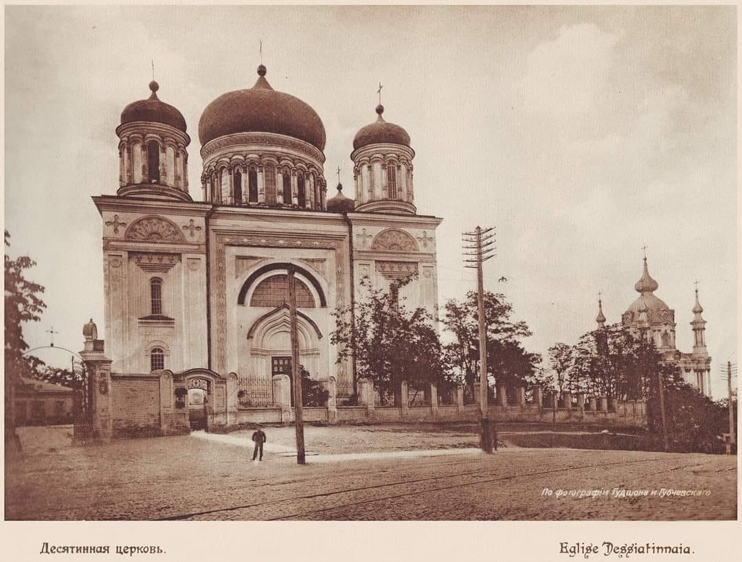 "Десятиная церковь. 1900е. Фототипия С. Кульженко. Десятинная церковь или Церковь Успения Пресвятой Богородицы - христианская церковь, возведенная на Старокиевской горе в Киеве в 989-996 годах. Считается первой каменной церковью Киевской Руси. Церковь разрушена во время монгольского нешествия Киева в 1240 году. Располагалась у городских ворот. На фото - Десятинная церковь Рождества Пресвятой Богородицы, построенная в 1842 году и разрушенная в 1928 году. Остатки фундамента Десятинной церкви вместе с городом Владимира являются памятником национального значения", - говорится в одном из сообщений.