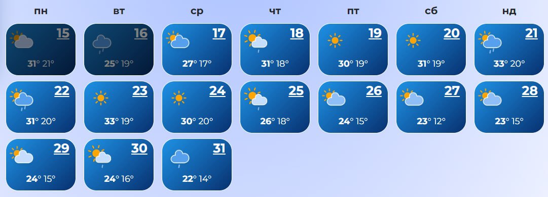 Так, 18 августа днем в Киеве прогнозируется до +31 градуса. Жара продержится до 24 августа, столбики термометров будут подниматься до +33 градусов. Дожди до конца лета могут пройти 18, 21, 22, 25, 30 и 31 числа. В последний день лета столбики термометров покажут до 22 градусов тепла.