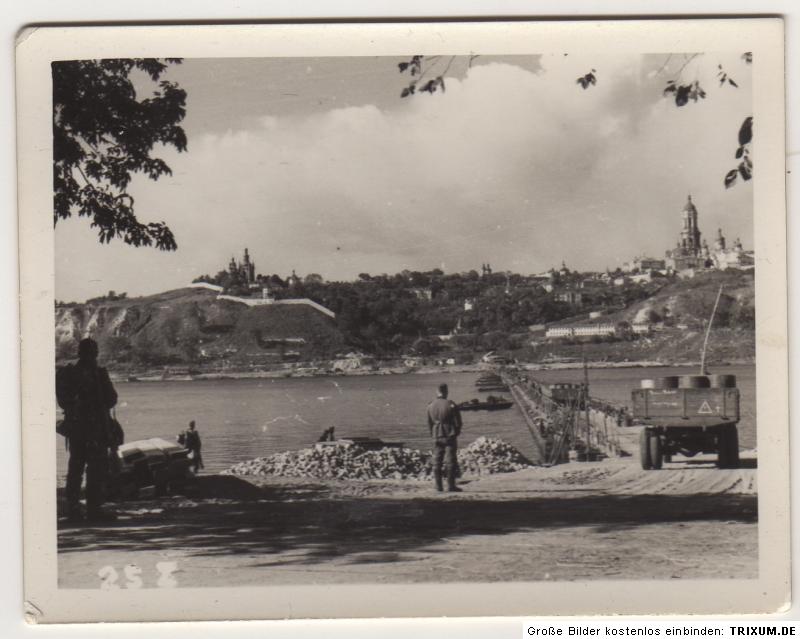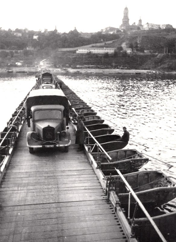 "Понтонная переправа через Днепр, 1941 год. Рядом выгружены камни для строительства будущего моста Шарнхорста. Эти камни до сих пор можно увидеть на берегу гидропарка", - так подписано фото.