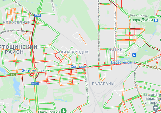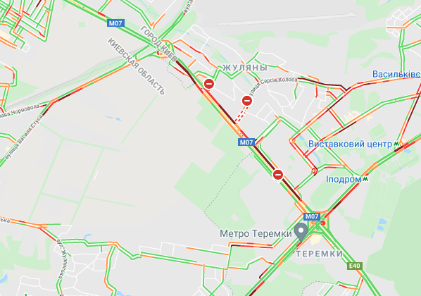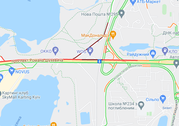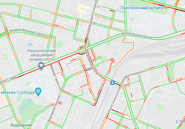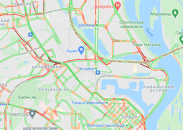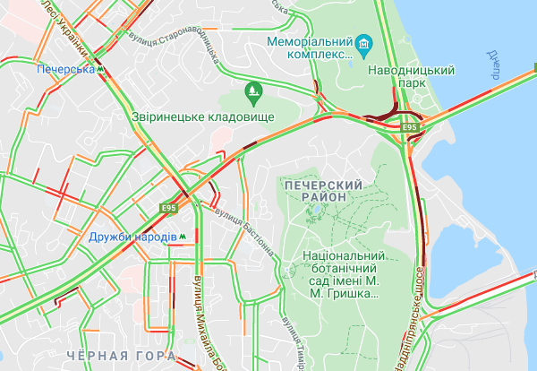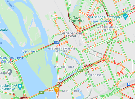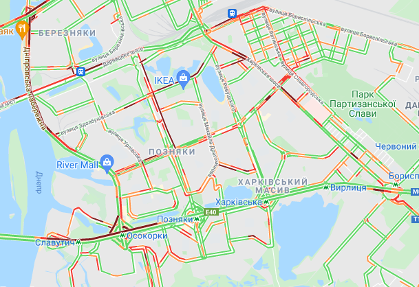 Трудно проехать по проспекту Соборности, ул. Оноре де Бальзака и проспекте Романа Шухевича. Стоят авто в пробке по проспекту Николая Бажана, между станциями метро "Осокорки" и "Славутич". Трудно проехать по Днепровской набережной, Харьковском и Дарницком шоссе.
