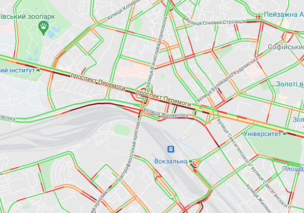 Авто стоят в небольших пробках на проспекте Победы. Трудно проехать по ул. Жилянская. Затруднено движение по Набережно-Крещатицкой и на бульваре Дружбы народов.